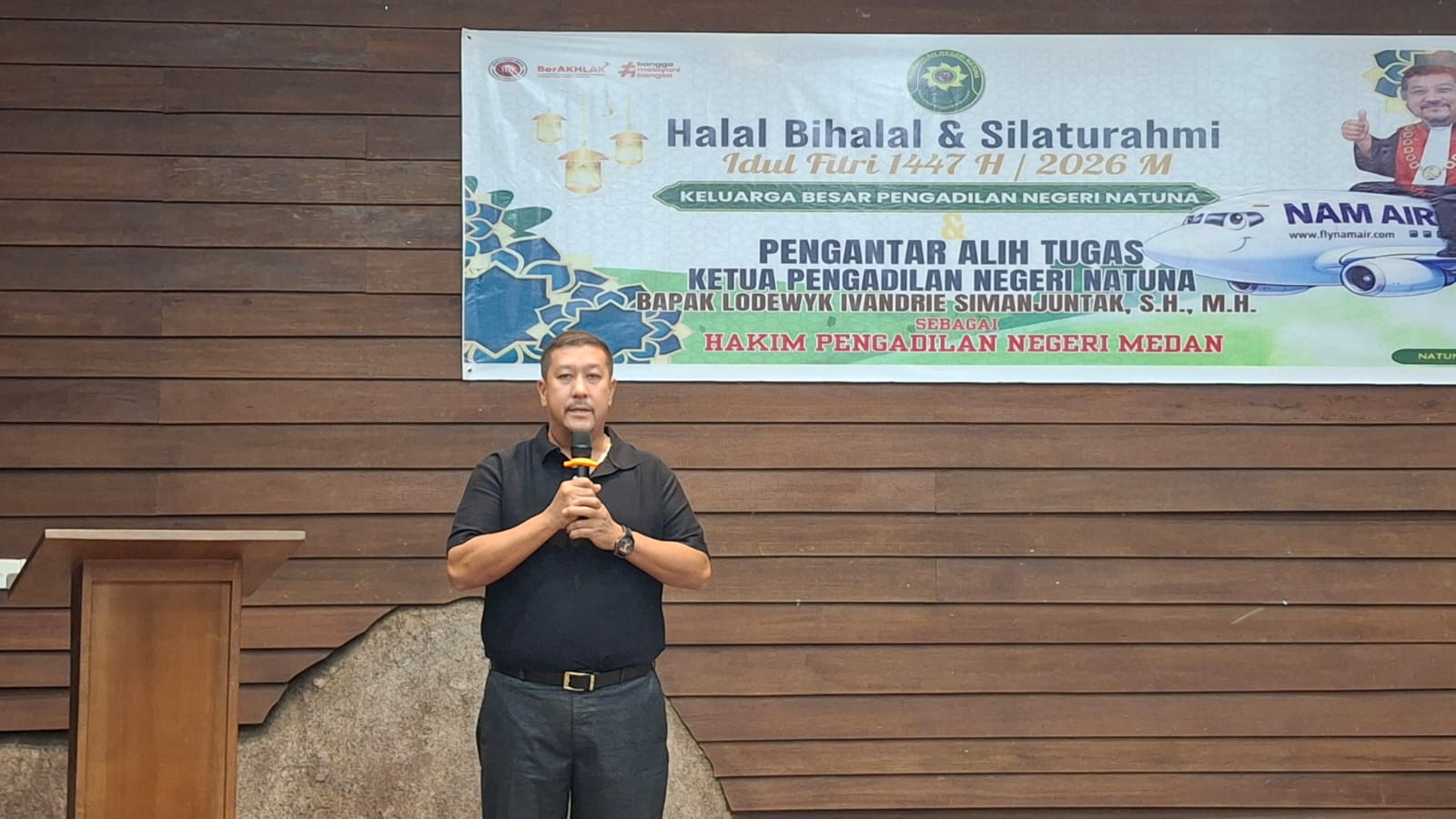 Natuna, 3 April 2026, Keluarga Besar Pengadilan Negeri Natuna menggelar acara Halal Bihala dan pengantar alih tugas Bapak Lodewyk Invandrie Simanjuntak, S.H.,M.H., yang mendapat promosi/mutasi sebagai Hakim di Pengadilan Negeri Medan.Acara diawali dengan sambutan dari Bapak Lodewyk Invandrie Simanjuntak, S.H.,M.H., yang menyampaikan apresiasi setinggi-tinggi atas dedikasi dan kebersamaan yang telah diberikban selama masa kepemimpinan beliau.