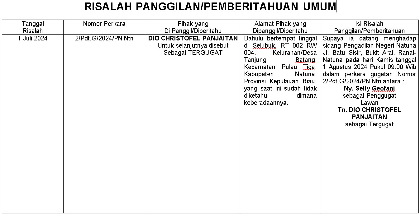 Risalah Panggilan / Pemberitahuan Umum Kepada Tergugat (Nomor 2/Pdt.G/2024/PN Ntn)
