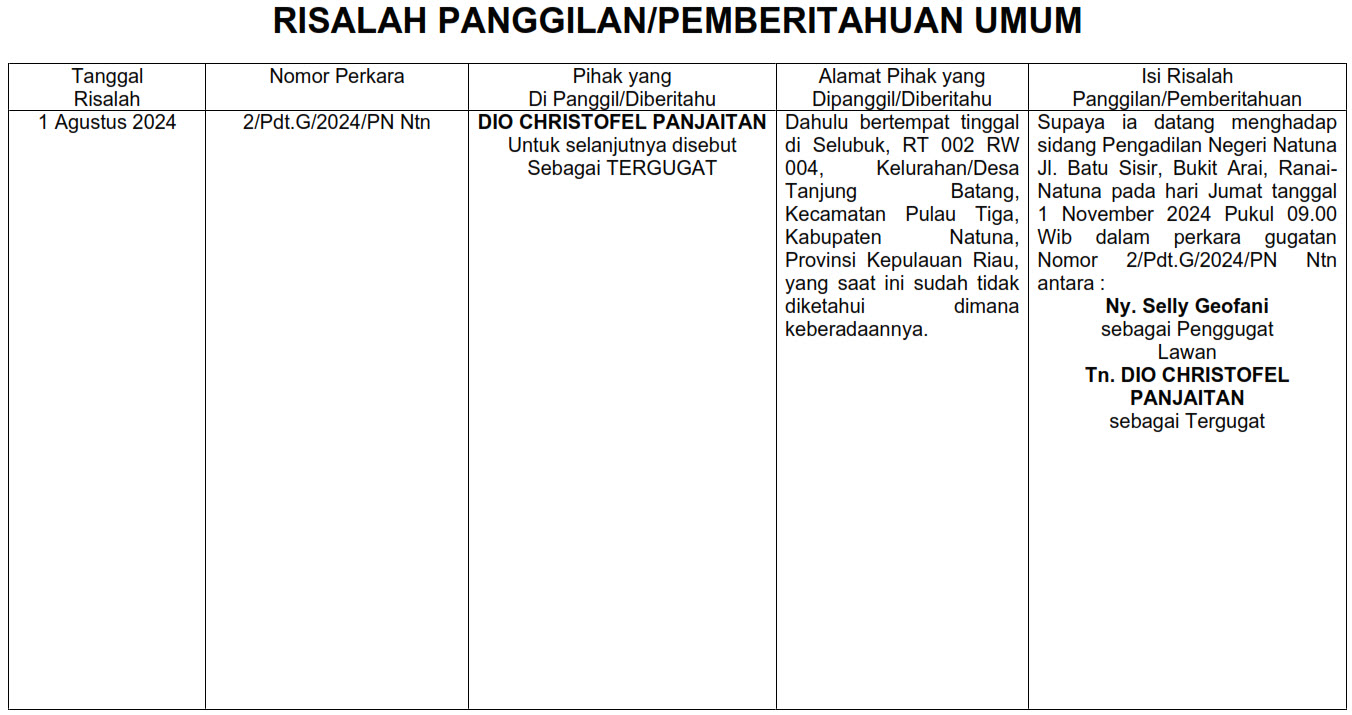 Risalah Panggilan / Pemberitahuan Umum Kepada Tergugat (Nomor 2/Pdt.G/2024/PN Ntn) - Panggilan Ke-2